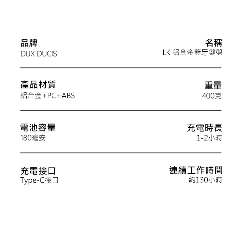 .內 容 物 :LK 鋁合金藍牙鍵盤*1、Type-C 線*1