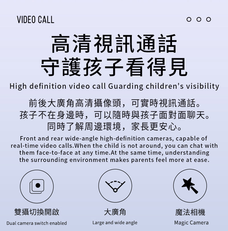.雙攝像頭設計 配備雙攝像頭,支持遠程視訊通話和遠程拍照,無論何時何地,隨時和孩子保持聯繫,記錄他們的每個精彩瞬間。