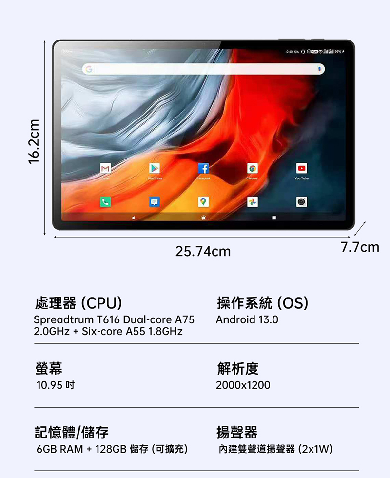 .搭載 10.95 吋 2000x1200 高解析 IPS 大螢幕,無論是追劇、閱讀或辦公都細膩清晰。內建 Unisoc T616 八核心處理器,搭配 6GB RAM + 128GB ROM 大容量儲存,多工處理不卡頓,支援 TF 卡擴充,讓儲存自由不設限。