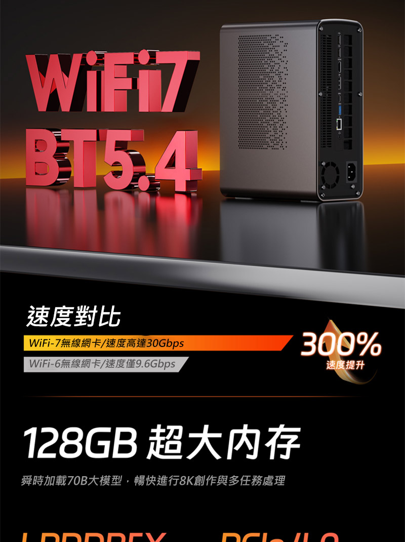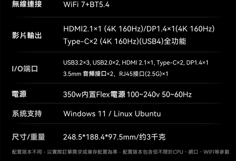 .網路:無線 WIFI 7(2.4G/5G) + 藍牙 5.4 + RJ45(2.5G)網路孔