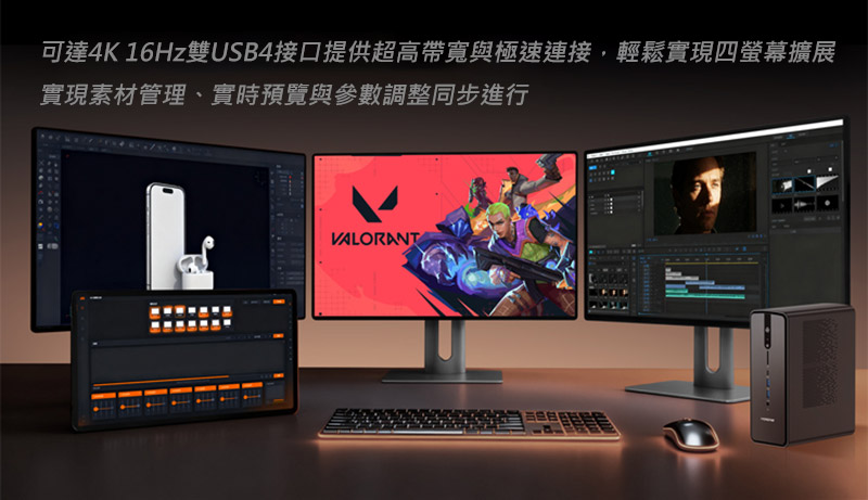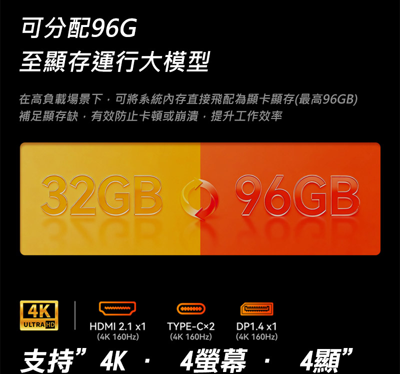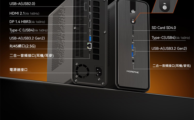 .輸出:HDMI2.1*1(4K 160Hz)、DP1.4*1(4K 160Hz)、Type-C*2(4K 160Hz)(USB4)全功能