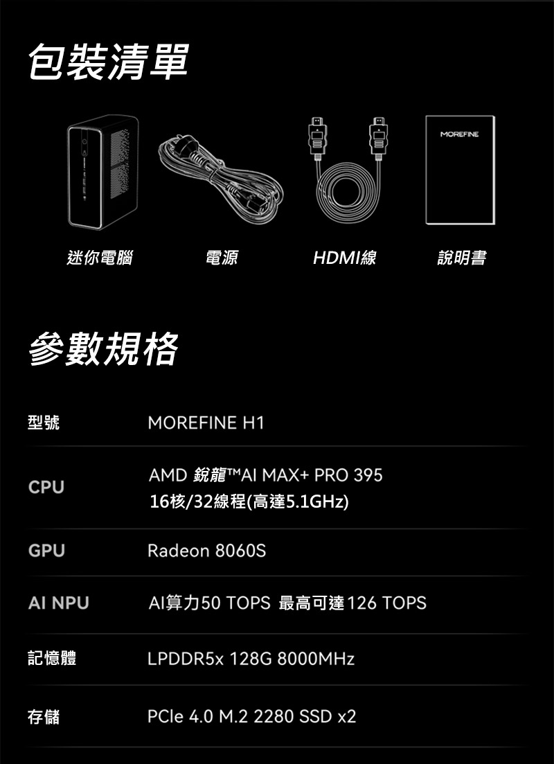 .內容物:H1 AI電腦(AMD AI MAX+PRO 395)*1、電源線*1、HDMI線*1