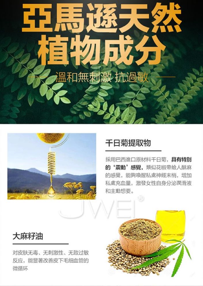 採用天然植物成分萃取大麻籽油,溫和無刺激混合了酥麻跳動刺激感與熱感交替,