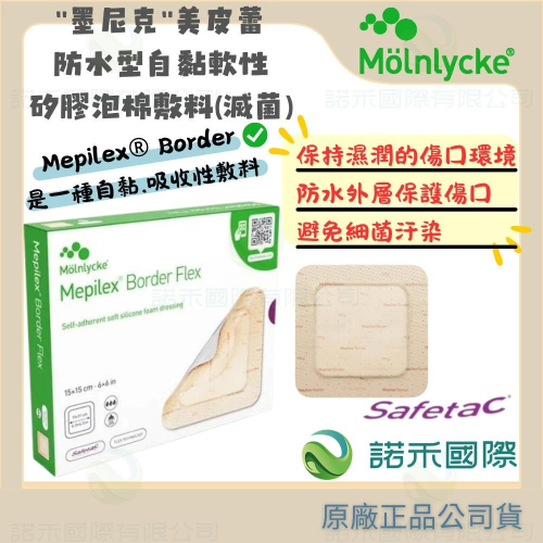 消費者使用前應詳閱醫療器材說明書 醫療器材品名: “墨尼克” 美皮蕾防水型自黏軟性矽膠泡棉敷料(滅菌) "MOLNLYCKE" MEPILEX BORDER SAFETAC SELF-ADHERENT SOFT SILICONE FOAM DRESSING (Sterile) 醫療器材許可證字號/登錄字號 :衛署醫器輸壹字第000116 號 許可證所有人或登錄者之名稱 :台灣墨尼克醫療用品股份有限公司 許可證所有人或登錄者之地址 :臺北市大安區敦化南路2段60號2樓之1 製造業者名稱 :MOLNLYCKE HEALTH CARE OY 製造業者地址 :PO Box 76 SAIMAANKATU 6 FI-50101 MIKKELI FINLAND 製造批號、製造日期、有效期間如原廠包裝上所示 產品說明 Mepilex®Border 是一種自粘、吸收性敷料,可保持濕潤的傷口環境。 防水外層保護傷口免受汙染以及細菌的影響。 Mepilex® Border 有5層結構: •軟性矽膠傷口接觸層 (Safetac®) •輕薄柔軟且具吸收性的 polyurethane 泡棉 •無紡布擴散層 •超吸收纖維層 •透氣、防水的薄膜外層 具有 Safetac®傷口接觸層,這是一種獨特技術,更換敷料時可減低患者疼痛及傷口和周圍皮膚的創傷。 適應症 Mepilex® Border 適用於各種滲出性傷口,如下肢和足部潰瘍、壓瘡和皮膚撕裂等創傷性傷口,及二次癒合傷口。Mepilex®border 也可用於保護破損或脆弱皮膚,且可以用於預防壓力性損傷。 使用說明 1. 清潔傷口。 2.擦乾傷口周圍皮膚。 3. 撕下保護膜,將有黏性的一面敷在傷口上,黏貼敷料時不要施力拉扯敷料。 4. 泡棉範圍應蓋過傷口周圍1-2公分。 敷料的更換間隔可能為數天。在敷料吸收飽和之前、或出現滲漏時、或者按照醫護人員指示來更換敷料。 可與壓力繃帶或搭配傷口凝膠使用 Mepilex®Border。 用於預防壓力性損傷:確保泡棉覆蓋超過壓力性損傷或組織受損之高風險的部位。 注意事項 禁止用於對數料或已知對敷料成分過敏的患者。 不可和氧化劑(如:次氣酸溶液、雙氧水)一起使用。 如果出現發燒等臨床感染症狀,或者如果傷口或周圍皮膚變紅、發熱或者腫脹,請諮詢醫護專業人員獲取適當治療。 不可重複使用。重複使用,產品可能已被汙染,造成傷口感染風險。 本產品為無菌包裝。使用之前如無菌包裝已破損,請勿使用。禁止重複滅菌。 其它資訊 本產品中採用的PU材料,若暴露於陽光照射、空氣接觸或高溫,顏色可能變得泛黃。在有效期限到期前、包裝完整無損情況下,顏色的變化不會影響產品品質。 製造日期:最新效期 有效期間(或保存期限):3年 製造日期會因庫存批次而有所不同,請詳見產品包裝標示 【藥商執照】 ▍藥商名稱:諾禾國際有限公司 ▍藥商地址:新北市新莊區中信街178號24樓之5 ▍藥商許可執照字號:新北府莊衛醫器販 字第MD6231056910號 ▍藥商諮詢專線:02-77529828 ▍營業時間:週一至週五 09:00-22:00