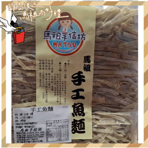 魚麵是馬祖相當特殊的風味麵,通常是以馬加魚或鰻魚為主原料加上麵粉去加工,再曬乾包裝。 魚麵的製作過程相當複雜,吃起來別有風味,是非常多人必買的馬祖伴手禮。