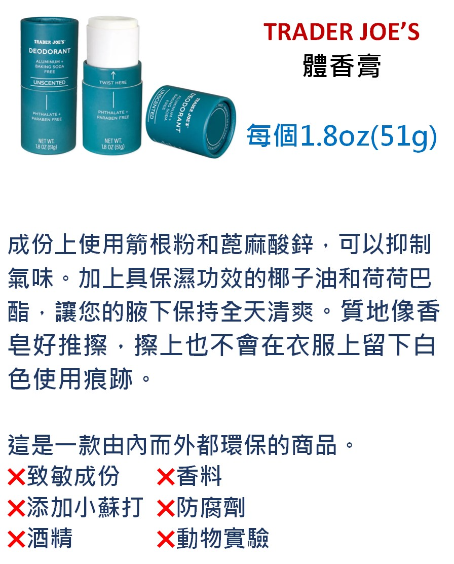 ** 台灣現貨 ** Trader Joe's 缺德舅 體香膏 天然無味 美國運回