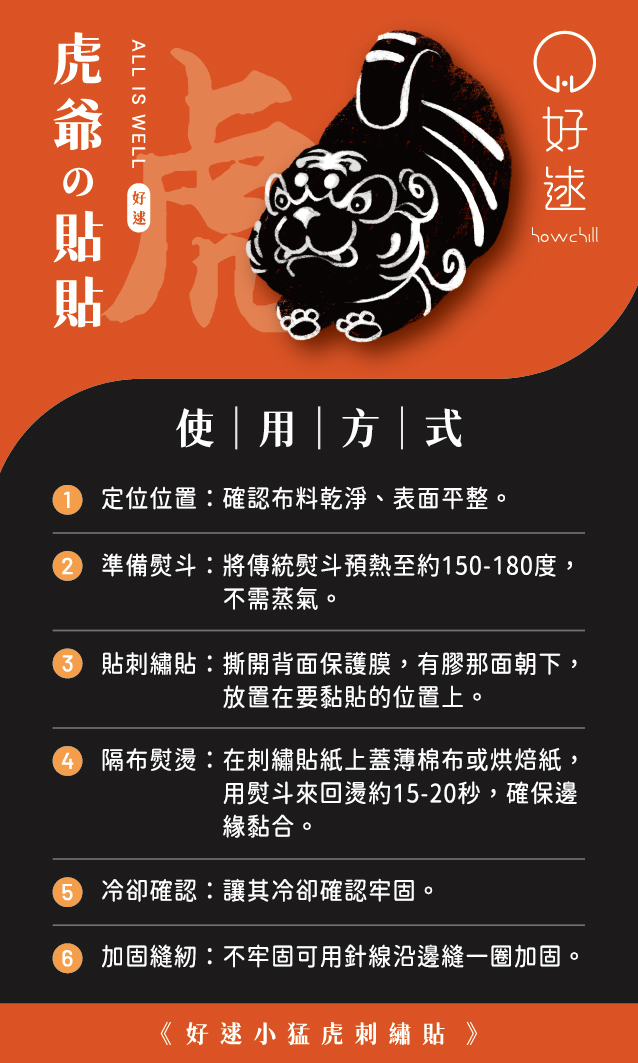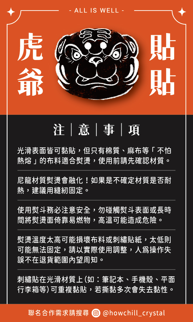 建議張貼在平滑面,若需燙貼請選擇耐高溫布料(尼龍不行喔!)