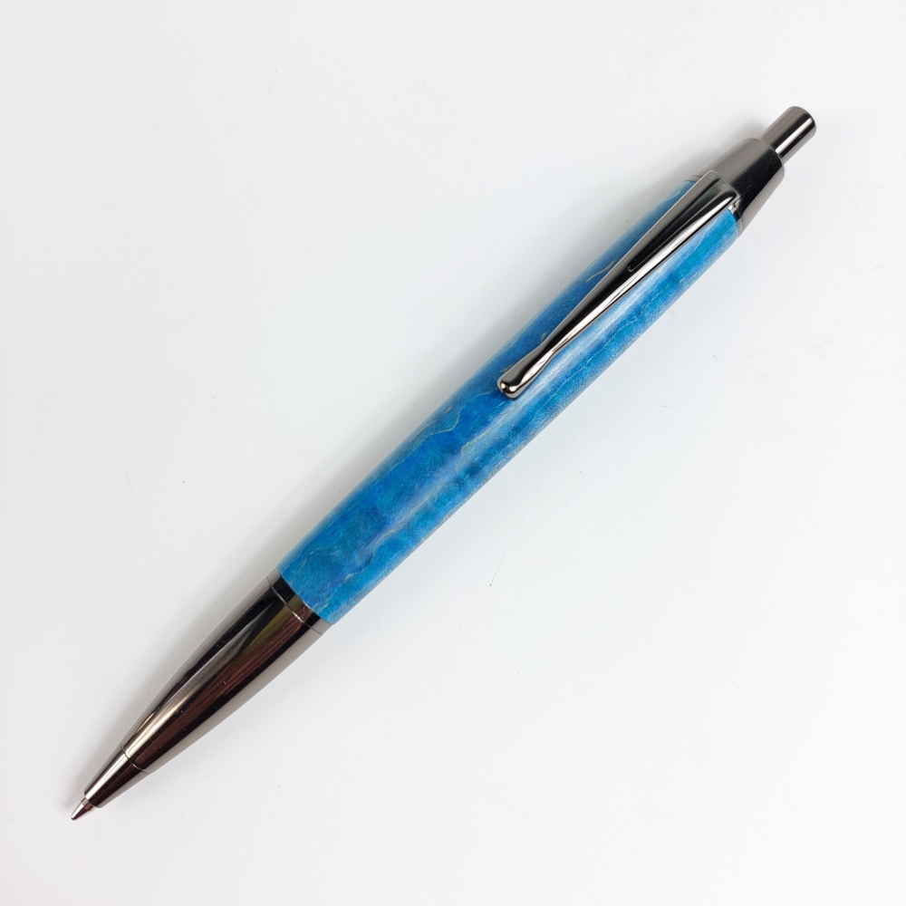 用台灣製作的高品質金屬套件來製作手工筆,讓溫潤的木頭包圍冰冷的金屬,他發現閃閃發亮的金屬與樹木木紋相互輝映,襯托出獨特的美麗。