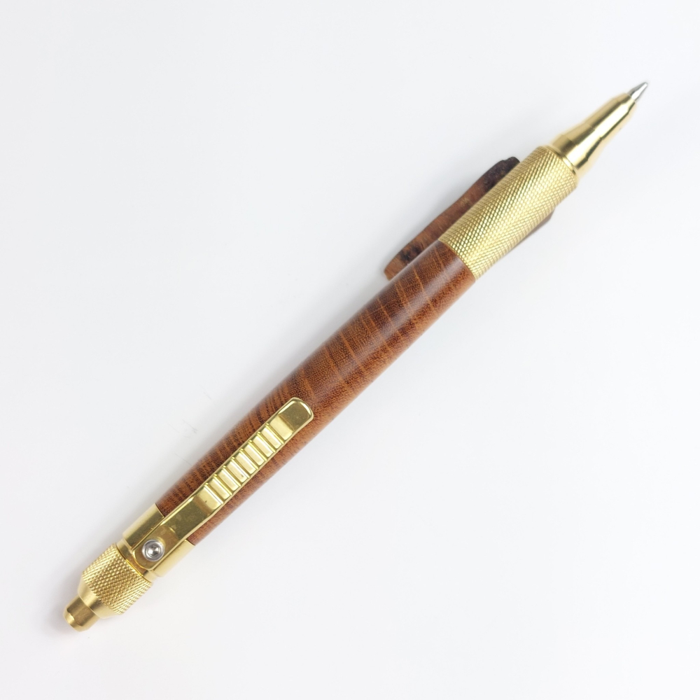 用台灣製作的高品質金屬套件來製作手工筆,讓溫潤的木頭包圍冰冷的金屬,他發現閃閃發亮的金屬與樹木木紋相互輝映,襯托出獨特的美麗。