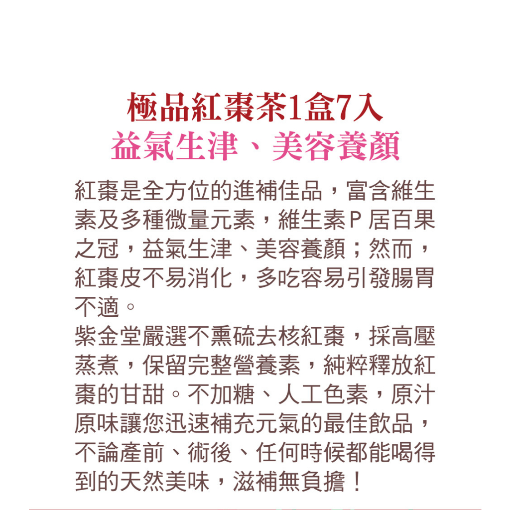 嚴選不熏硫去核紅棗,採用高科技先進技術高壓蒸煮保留完整營養,不加糖、人工色素,純粹釋放紅棗的甘甜;是您迅速補充元氣的最佳飲品,不論產前、術後、任何時候都能喝得到的天然美味。