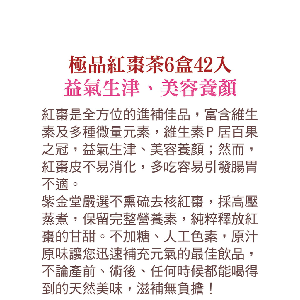嚴選不熏硫去核紅棗,採用高科技先進技術高壓蒸煮保留完整營養,不加糖、人工色素,純粹釋放紅棗的甘甜;是您迅速補充元氣的最佳飲品,不論產前、術後、任何時候都能喝得到的天然美味。