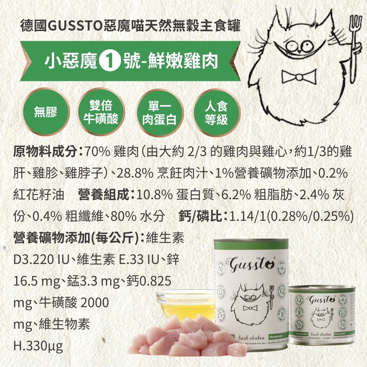 營養添加(每公斤):維生素D3:220IU、維生素E:33IU、鋅16.5mg、錳3.3mg、鈣0.825mg、牛磺酸2000mg、維生素H:330µg