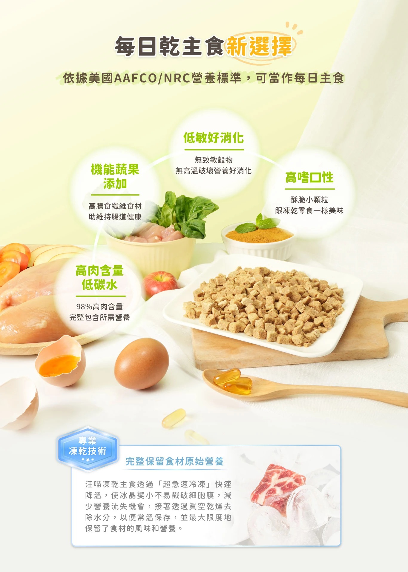汪喵小方粒凍乾主食餐由於成分天然無添加防腐劑,開封後請儘快食用完畢。