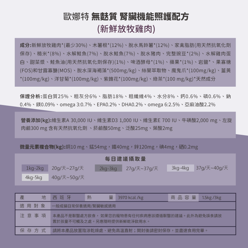 ●成分:成分:新鮮放牧雞肉*(最少30%)、木薯根*(12%)、脫水馬鈴薯*(12%)、家禽脂肪(用天然抗氧化劑保存)、糙米*(8%)、水解鮭魚(7%)、脫水鮭魚(7%)、脫水豬肉、完整豌豆*(2%)、水解雞肉蛋白、甜菜漿、鮭魚油(用天然抗氧化劑保存)(1%)、啤酒酵母*(1%)、蘋果*(1%)、岩鹽”、果寡糖 (FOS)和甘露寡醣(MOS)、脫水深海褐藻*(500mg/kg)、絲蘭萃取物、魔鬼爪*(100mg/kg)、薑黃 *(100mg/kg)、洋甘菊*(100mg/kg)、紫錐花*(100mg/kg)、綠茶*(100 mg/kg)*天然成分