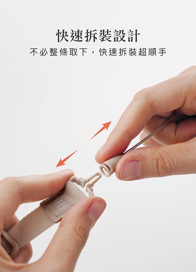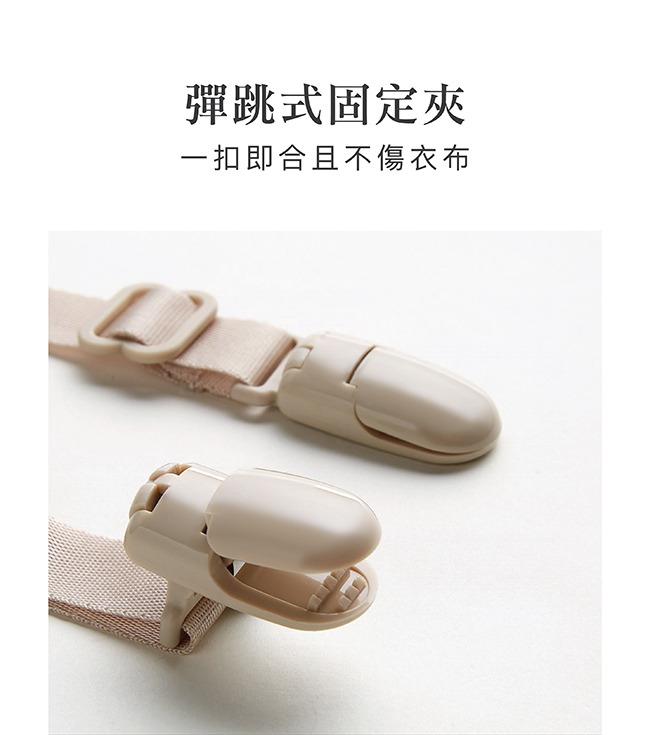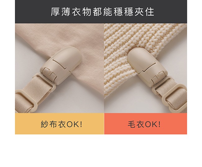 •彈跳式固定夾,一扣即合且不傷衣布,厚薄衣物都能穩穩夾住。