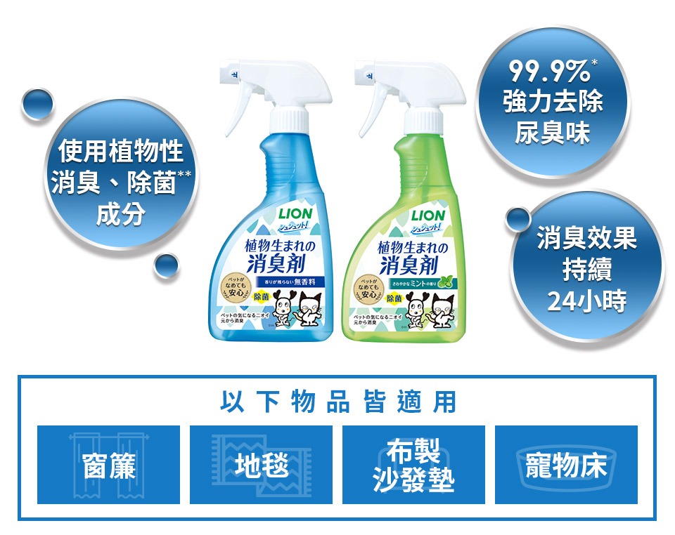 ・瞬間消除家中沙發椅等布製品易殘留的寵物特有臭味(糞尿臭及體味等)並除菌完成。