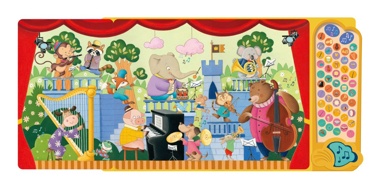 本書不只是音效書,也結合了「找找看」的遊戲!先觀察每個場景的10種樂器,再打開折頁,從超大、超精緻、超豐富的場景中找出這10種樂器,不只培養小朋友的專注力、觀察力、耐心,還能學習解決問題的能力。
