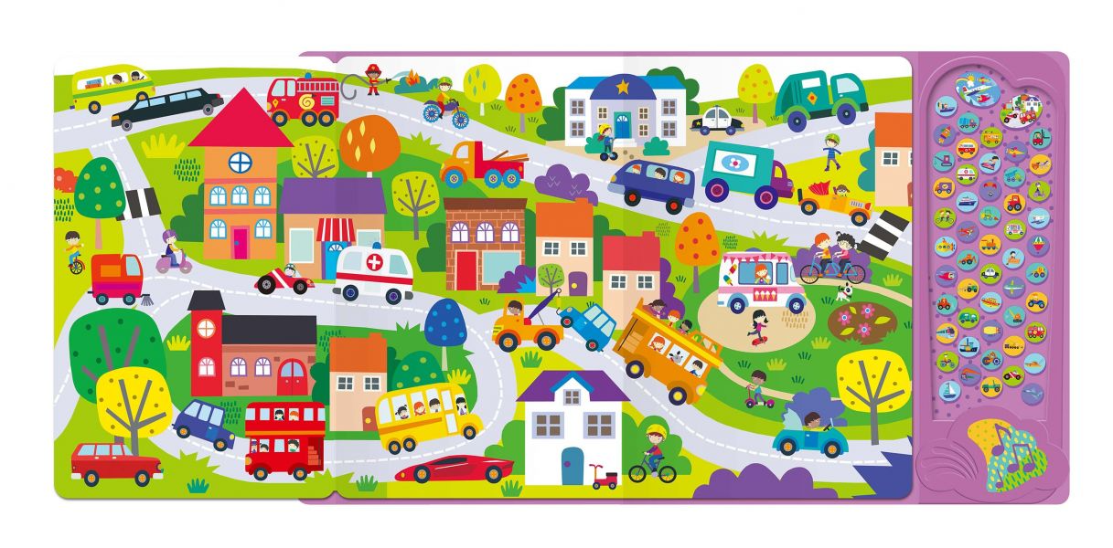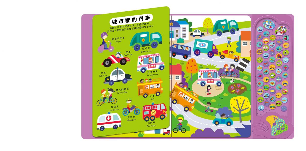 本書不只是音效書,也結合了「找找看」的遊戲!先觀察每個主題的10種交通工具,再打開折頁,從超大、超精緻、超豐富的場景中找出這10種交通工具,不只培養小朋友的專注力、觀察力、耐心,還能學習解決問題的能力。