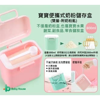 B1120-001 寶寶便攜式奶粉儲存盒(雙層-附奶粉匙)800ML(青蘋綠、櫻花粉2色)OPP包裝