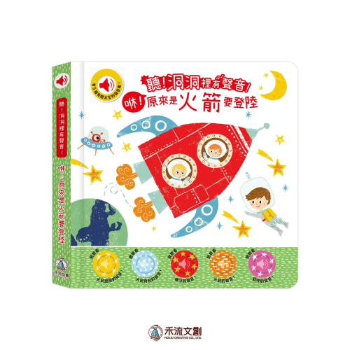 《聽!洞洞裡有聲音!》系列書,每本故事書都設計五種豐富的聲音,供孩子與正在閱讀的故事互動,只需要按下按鍵,就能夠聽見火箭起飛的聲音、外星飛船的嗶嗶聲、以及火箭背包噴射飛過太空的咻咻聲,可以帶給孩子聽覺上的刺激,幫助孩子累積感官經驗,幫助他更認識世界!