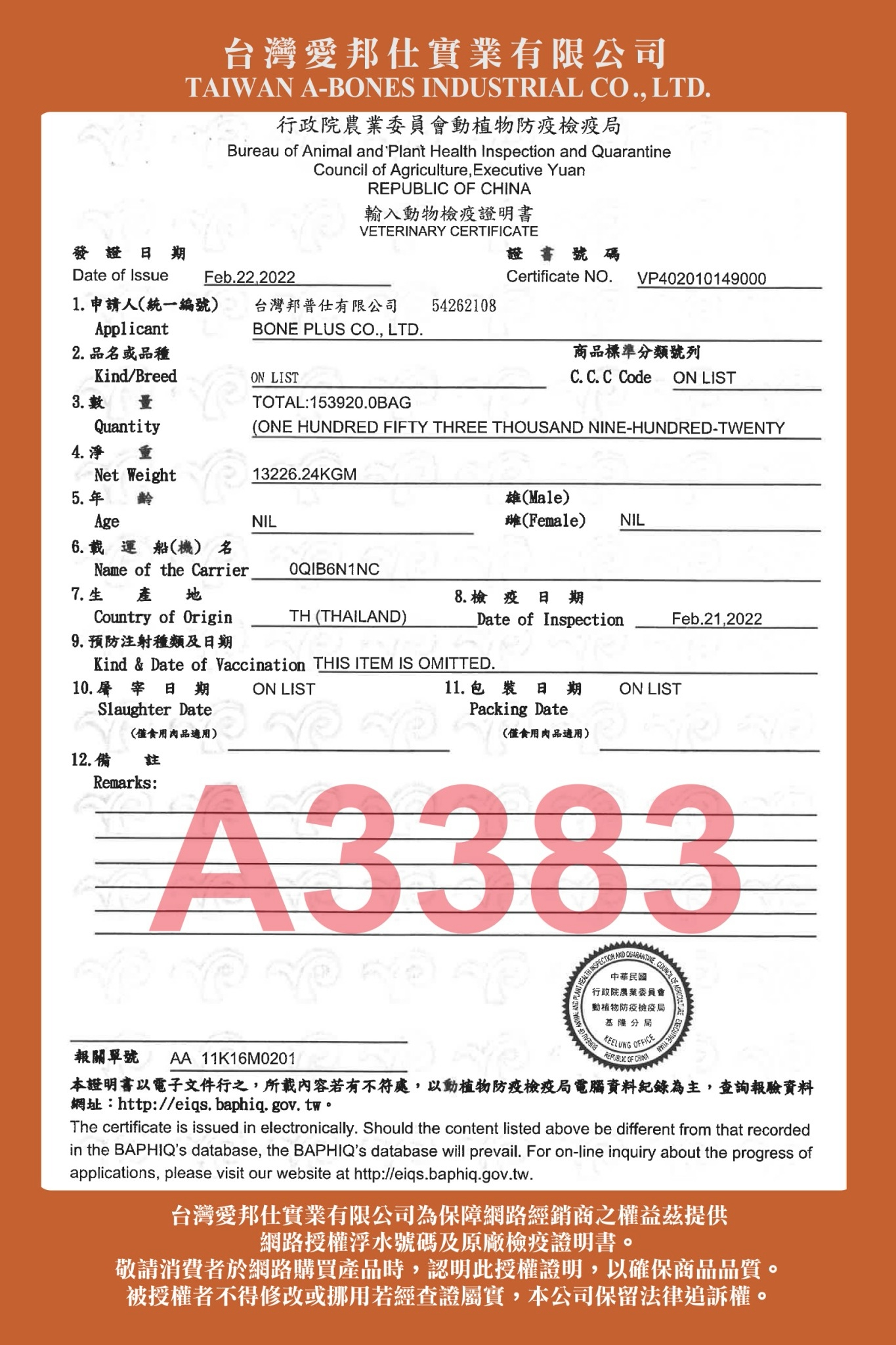 營養標示及含量:粗蛋白 55%↑,粗脂肪 15%↑,粗纖維 2%↓,粗灰分 8%↓,水份 6%↓。