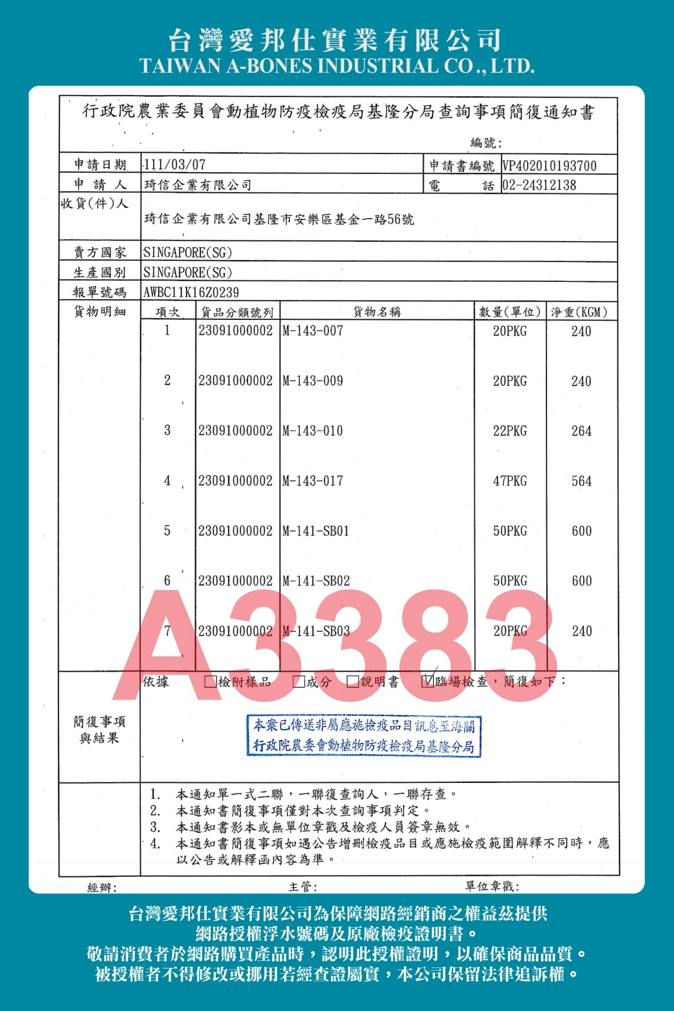 營蓑標示及含量:粗蛋白質12%,粗脂肪8%,水份4%,粗灰份2%,粗纖維1%