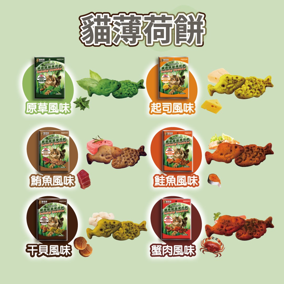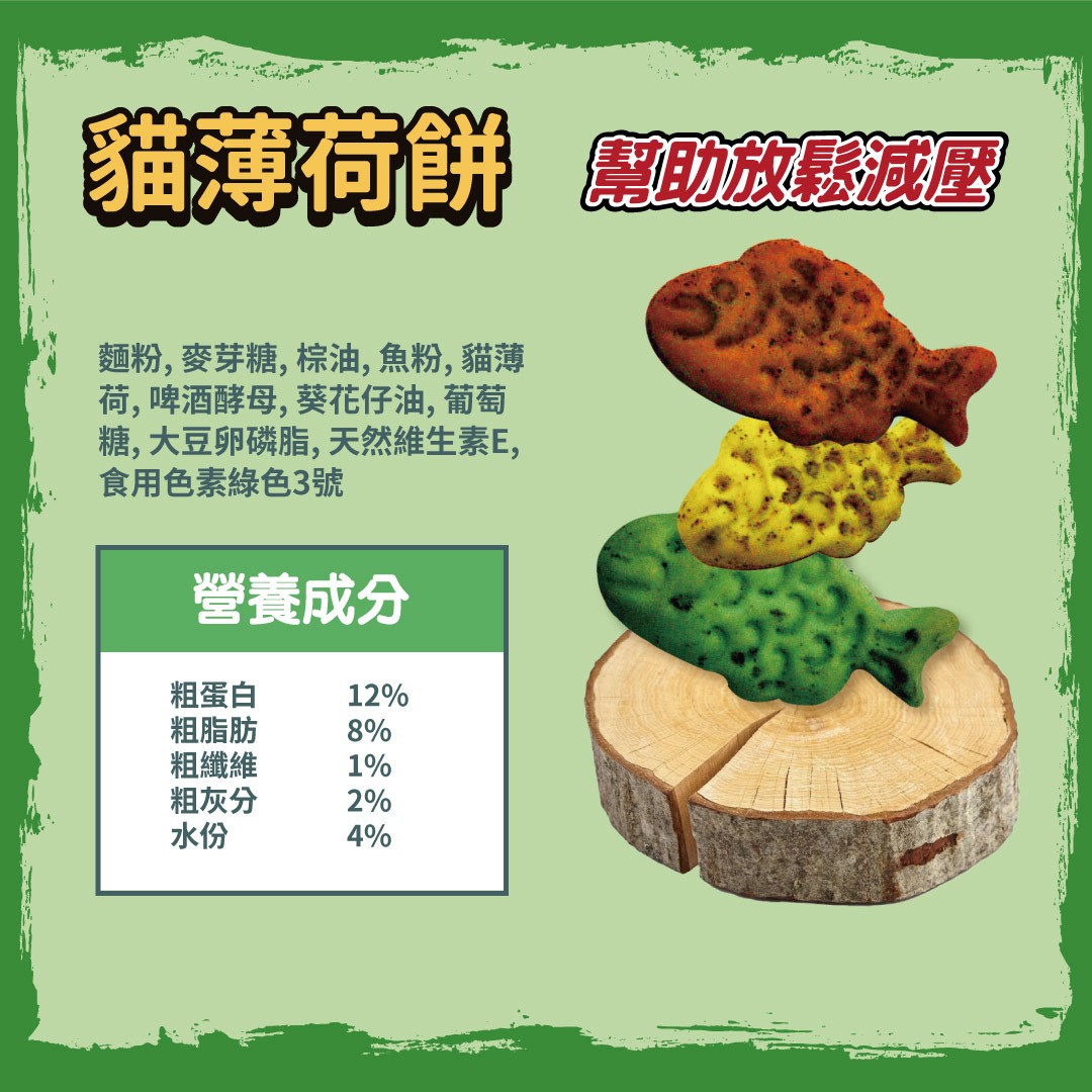 成份:麵粉,麥芽糖,棕油,魚粉,貓薄荷,啤酒酵母,葵花仔油,葡萄糖,大豆卵磷脂,天然維生素E,食用色素綠色3號