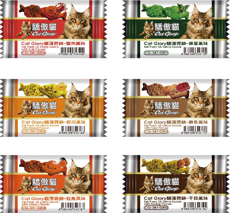 成分:麵粉,麥芽糖,棕油,魚粉,貓薄荷,啤酒酵母,葵花仔油,葡萄糖,大豆卵磷脂,天然維生素E,干貝風味,食用色素黃色4號