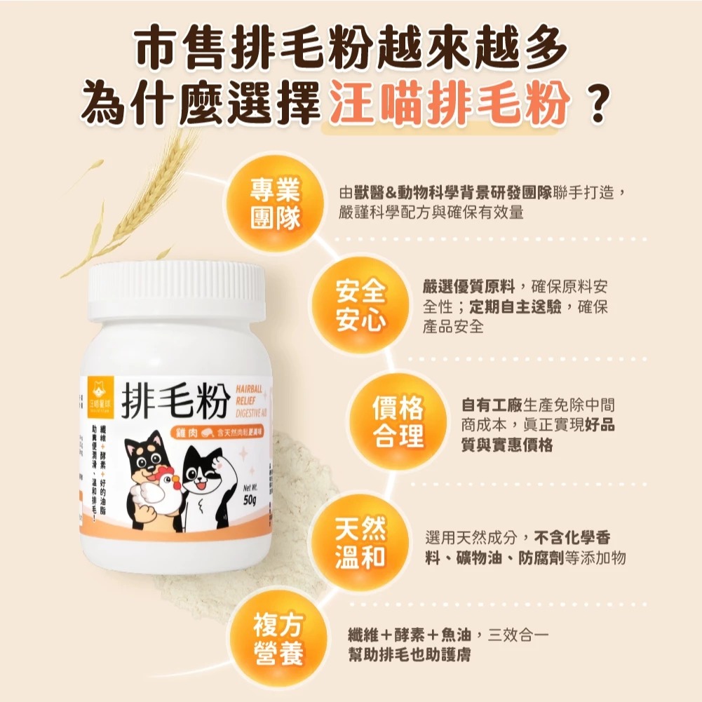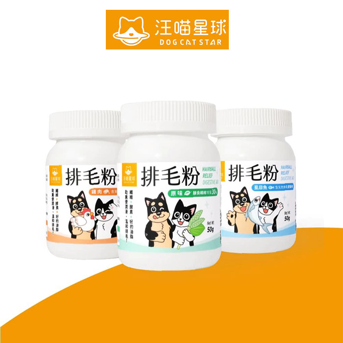 汪喵星球排毛粉成分為天然纖維與消化酵素、天然魚油&亞麻仁油,可幫助維持腸道健康及幫助糞便潤滑。雖然狗狗沒有頻繁舔毛的習性,但若玩耍時食入大量毛髮,還是可以補充排毛粉來幫助排除毛髮及幫助腸胃蠕動喔。