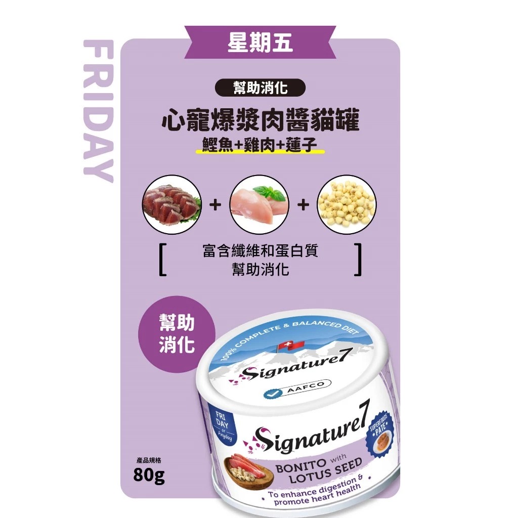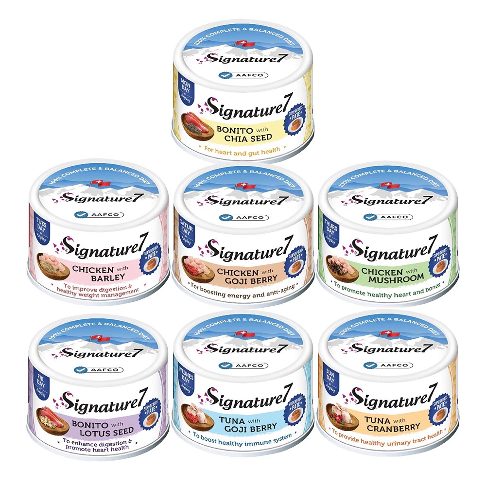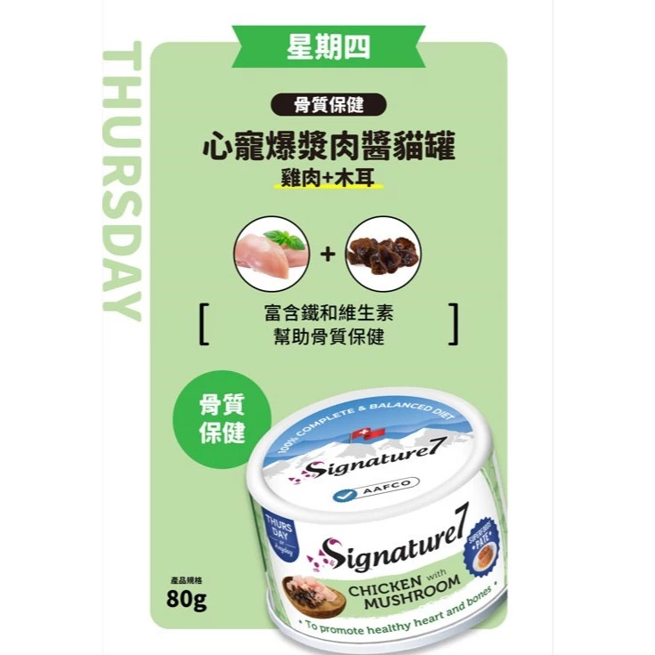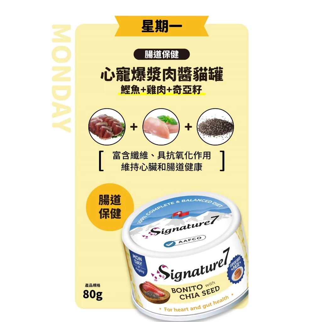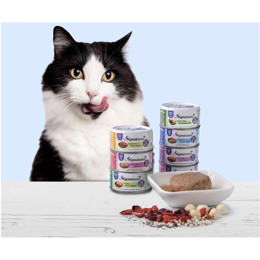 雞肉、水、鰹魚、奇亞籽、維生素和礦物質(磷酸三鈣、氯化鉀、氯化鈉、氯化膽鹼、硫酸鎂、硫酸亞鐵、氧化鋅、α-生育酚醋酸酯、菸鹼酸、維生素A乙酸酯、銅蛋白、硫酸猛、硝酸硫胺明、磷酸氫鈣、泛酸鈣、核黃素補充劑、鹽酸吡哆醇、生物素、維生素B12補充劑、亞硒酸鈉、膽鈣化固醇、葉酸、碘化鉀、氧化鎂)、肝臟、甘胺酸、穩定劑、著色劑、鮪魚萃取、牛磺酸
