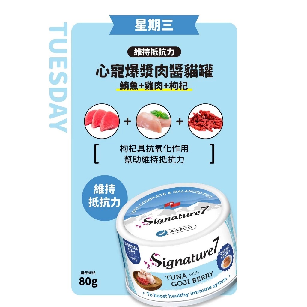 雞肉、水、鮪魚、枸杞、維生素和礦物質(磷酸三鈣、氯化鉀、氯化鈉、氯化膽鹼、硫酸鎂、硫酸亞鐵、氧化鋅、α-生育酚醋酸酯、菸鹼酸、維生素A乙酸酯、銅蛋白、硫酸錳、硝酸硫胺明、磷酸氫鈣、泛酸鈣、核黃素補充劑、鹽酸吡哆醇、生物素、維生素B12補充劑、亞硒酸鈉、膽鈣化固醇、葉酸、碘化鉀、氧化鎂)、肝臟、甘胺酸、穩定劑、著色劑、鮪魚萃取、牛磺酸