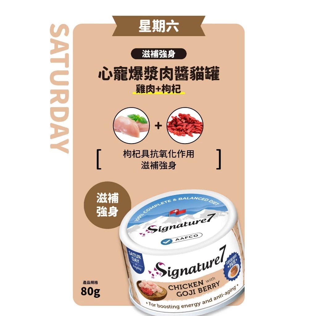 雞肉、水、魚、枸杞、甘胺酸、維生素和礦物質(磷酸三鈣、氯化鉀、氯化鈉、氯化膽鹼、硫酸鎂、硫酸亞鐵、氧化鋅、α-生育酚醋酸酯、菸鹼酸、維生素A乙酸酯、銅蛋白、硫酸錳、硝酸硫胺明、磷酸氫鈣、泛酸鈣、核黃素補充劑、鹽酸吡哆醇、生物素、維生素B12補充劑、亞硒酸鈉、膽鈣化固醇、葉酸、碘化鉀、氧化鎂)、肝臟、穩定劑、著色劑、鮪魚萃取、牛磺酸