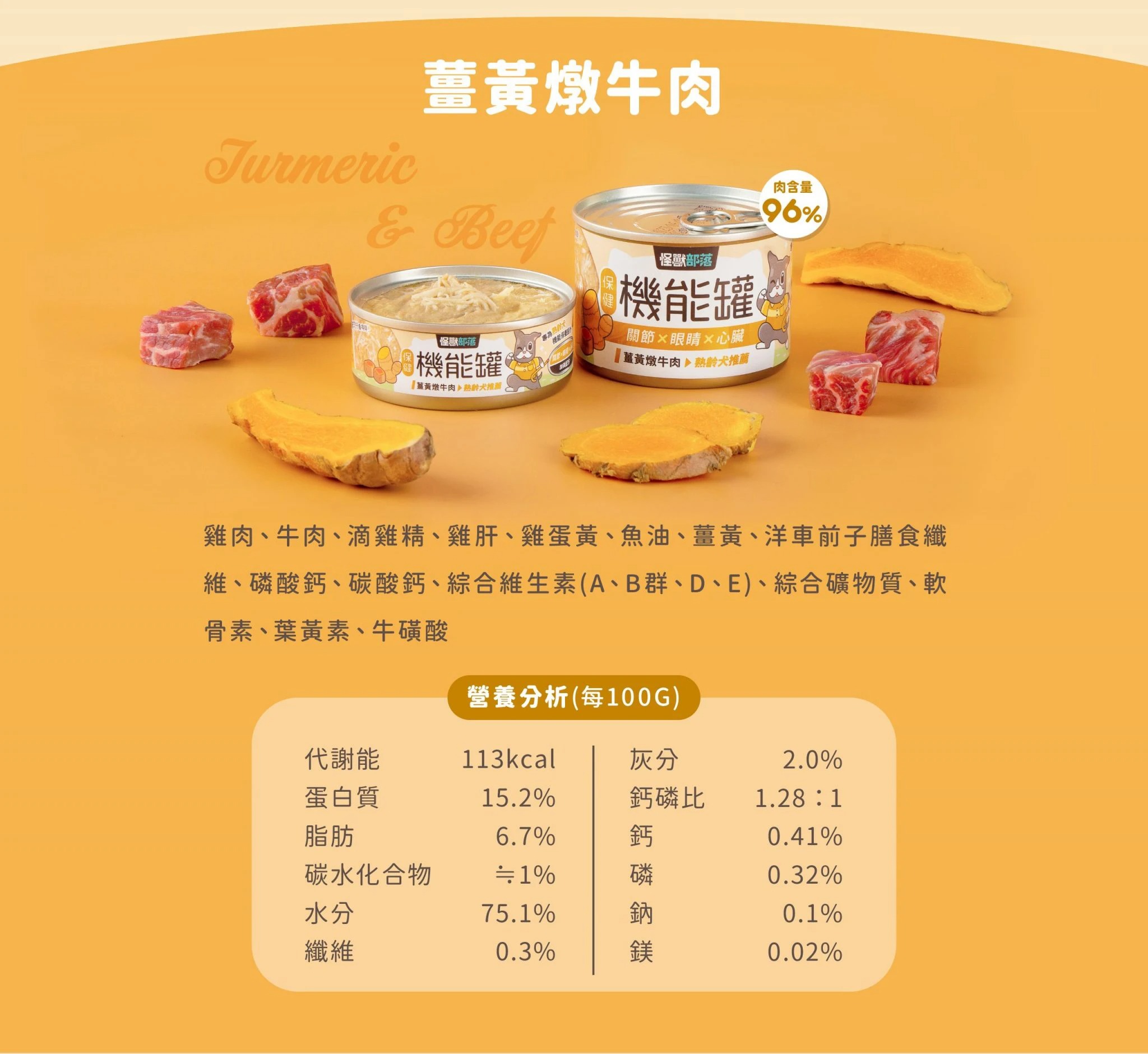 雞肉、牛肉、滴雞精、雞肝、雞蛋黃、魚油、黃、洋車前子膳食纖維、磷酸鈣、碳酸鈣、綜合維生素(A、B群、D、E)、綜合礦物質、軟骨素、葉黃素、牛磺酸
