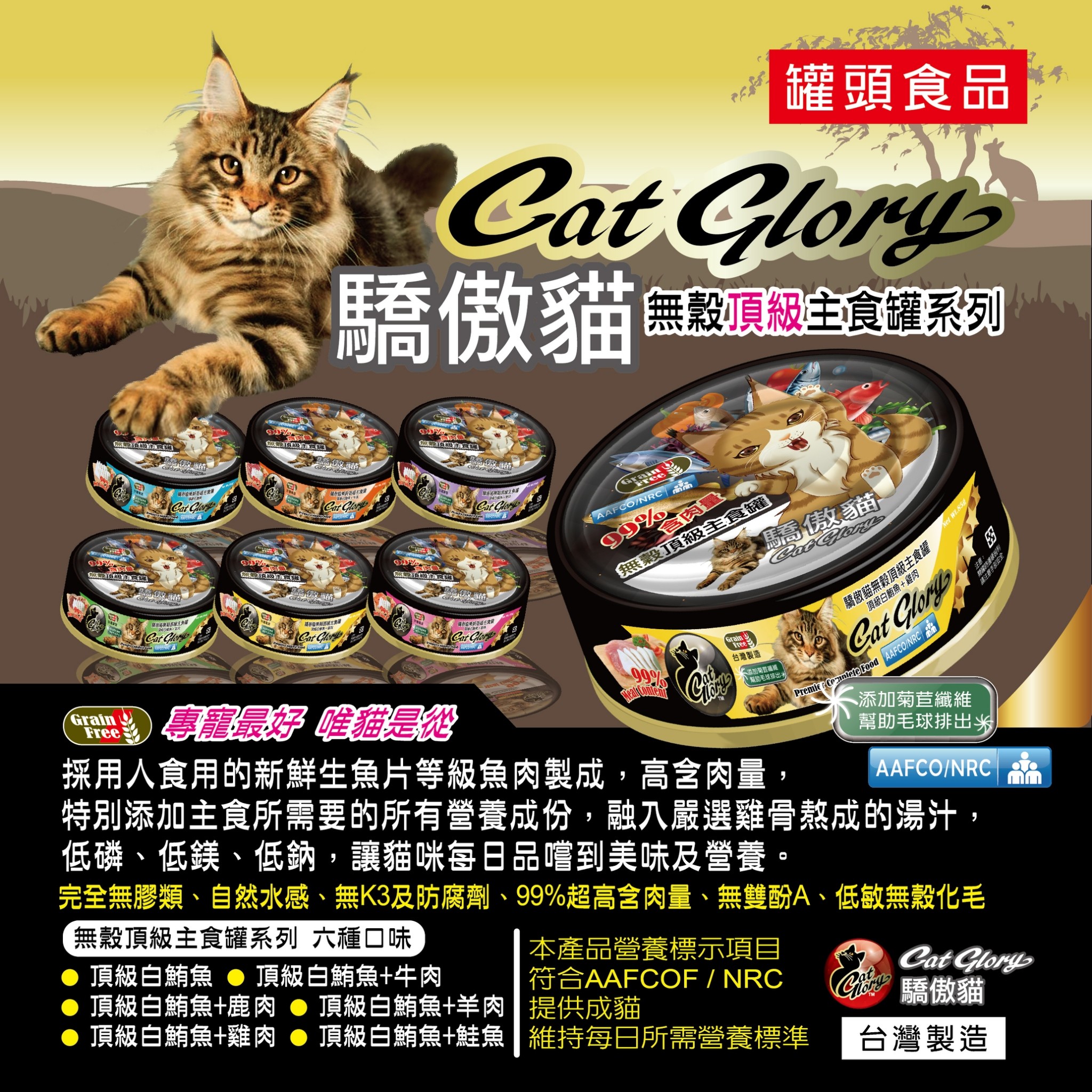 營養標示及含量:蛋白質 13%,脂肪 4.5%,灰份 2%,纖維 1%,水份 78%,牛礦酸 0.15%,碳水化合物 ≒1%,鈣 0.29%,磷 0.23%,鈣磷比 1.26:1,鈉 0.04%,鎂