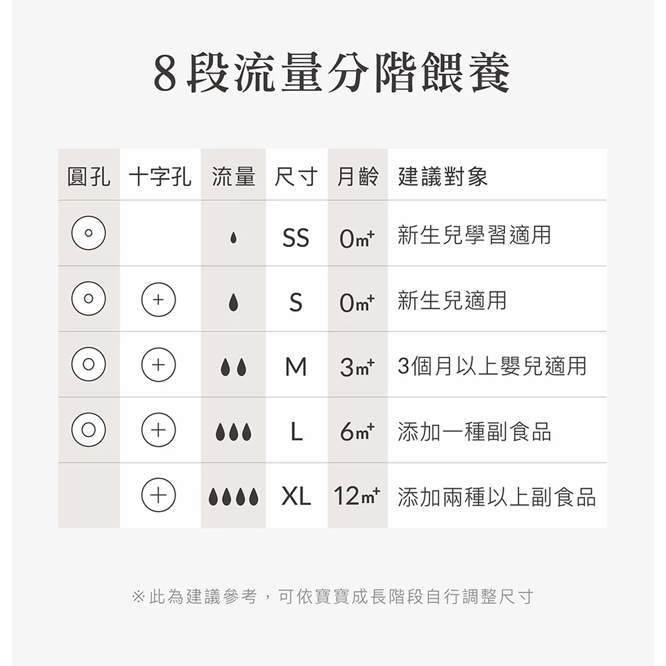 使用本產品前應確實清洗及消毒,並依寶寶吸吮能力、副食品濃稠度...等實際使用狀況,替換適合的孔徑與尺寸。