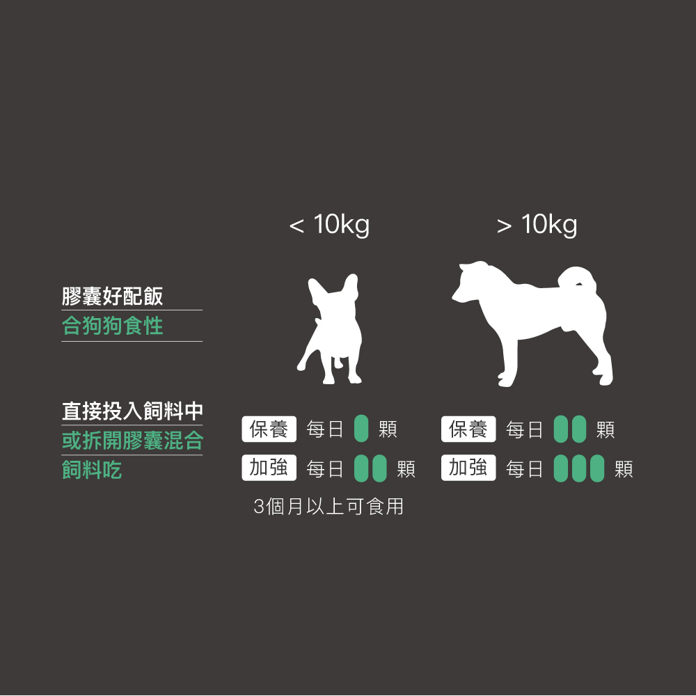 10公斤以上的狗每日保養2粒:加強3粒