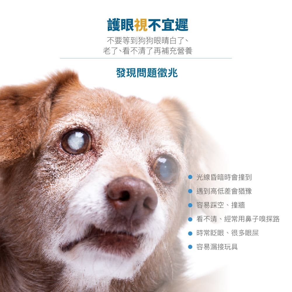 可作為「好發犬種」與「老年狗狗」的營養補充以及「眼睛不適」狗狗的護理營養。- 休養:快速集中休護眼睛