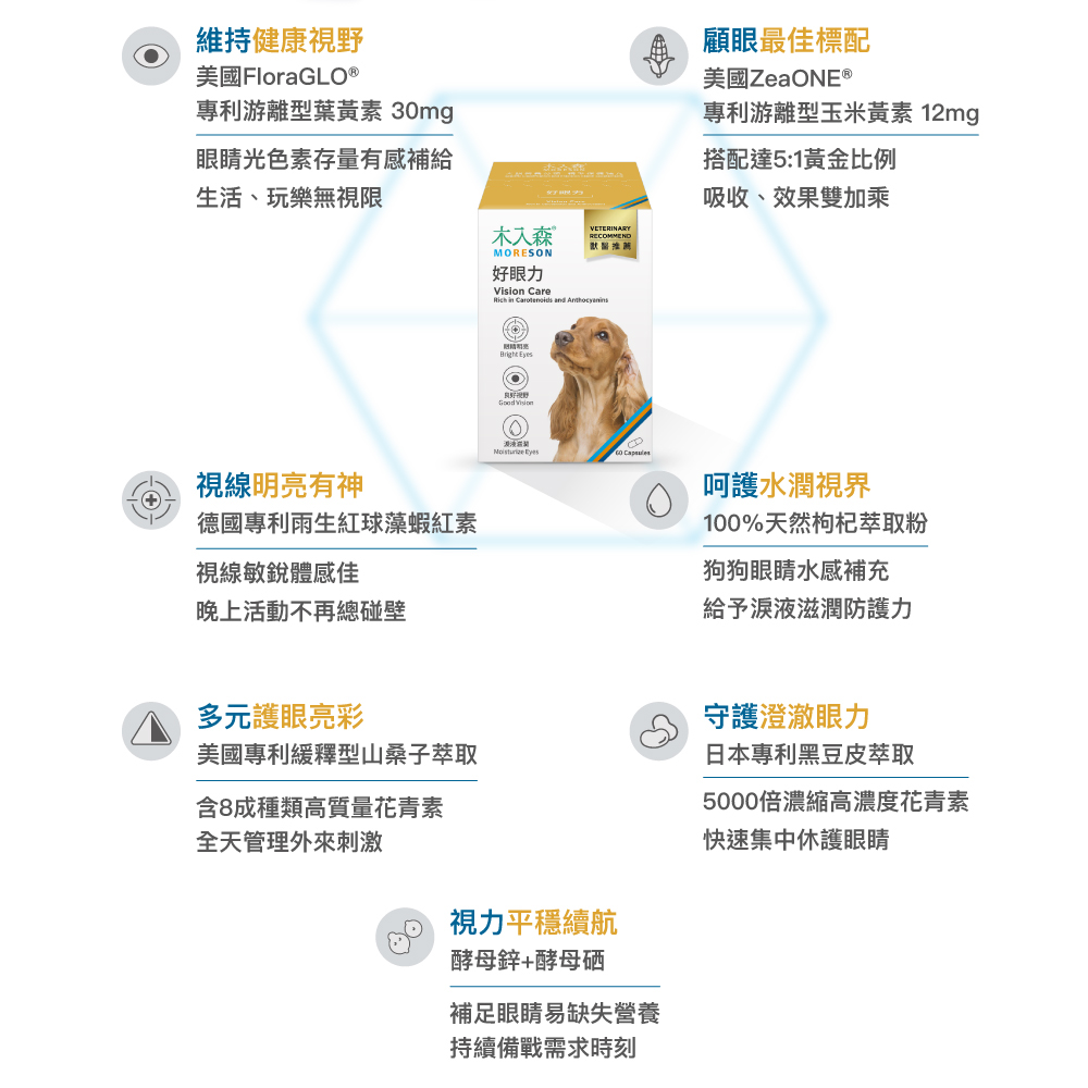 木入森犬寶好眼力,全方位眼睛保健葉黃素等 7 大配方,保護眼球與視力,補充眼睛流失營養,多元護眼明亮。