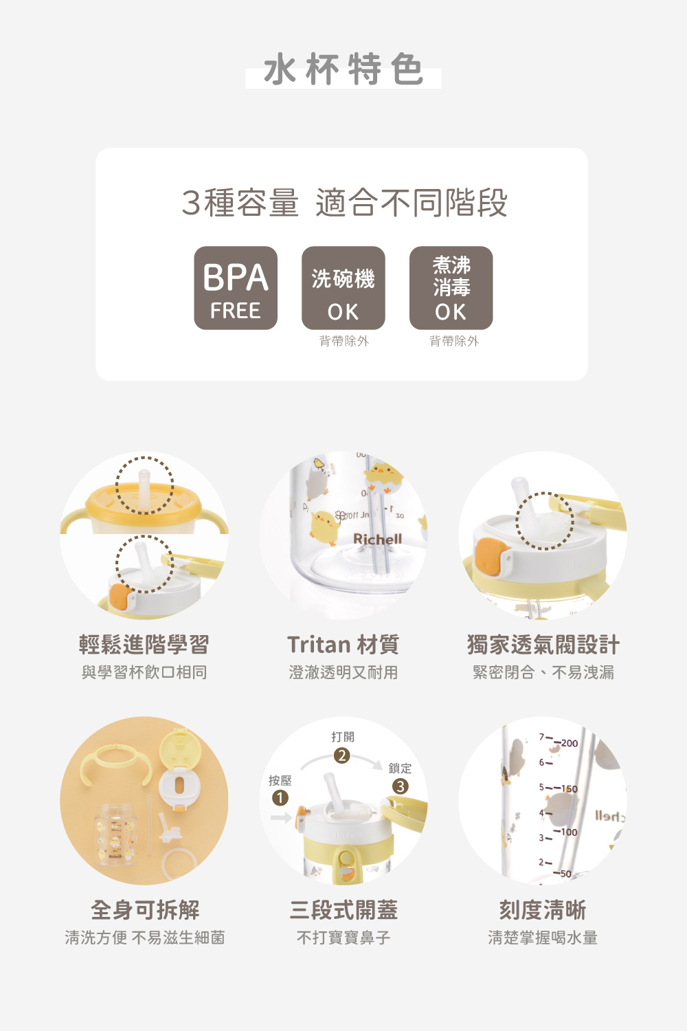 • 學習訓練杯和吸管水杯飲口前端形狀相同,可以自然過度、輕鬆進階學習