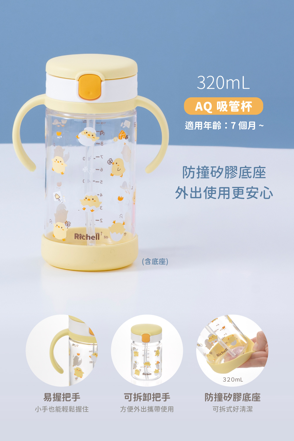 • 易握把手,小手也能輕鬆握住,可自行練習抓握飲用