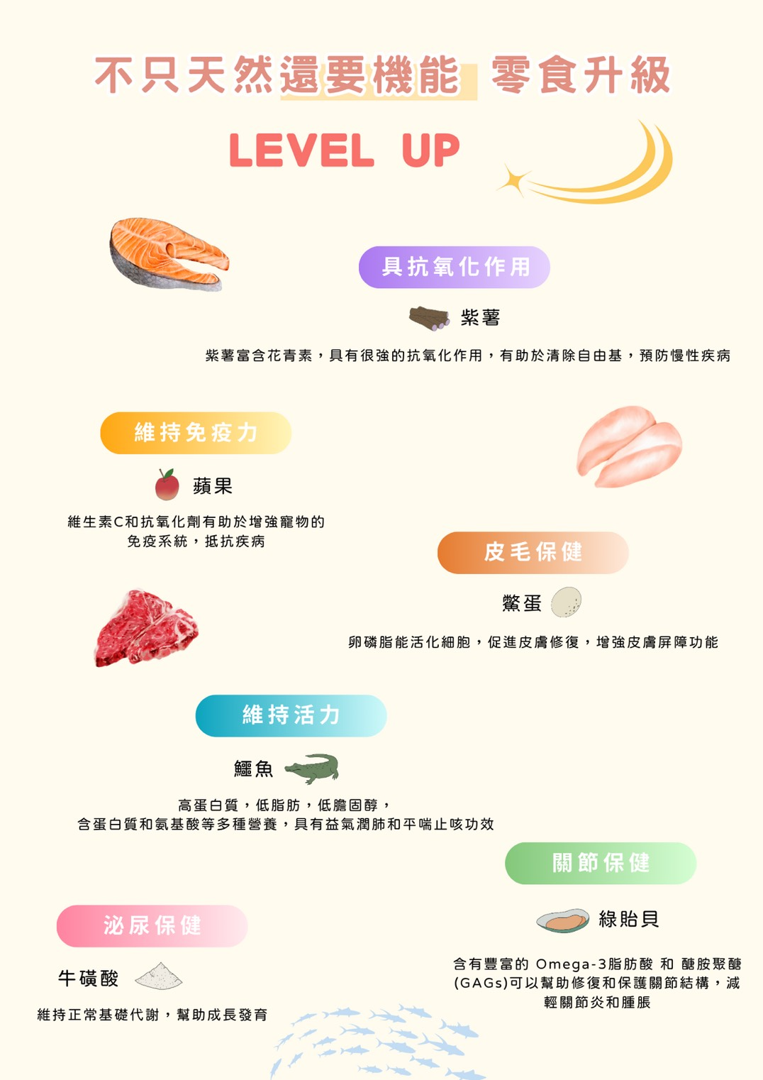 成分: 雞胸肉、鱷魚、草莓、燕麥、卵磷脂、牛磺酸、GABA、水、柴魚、木薯