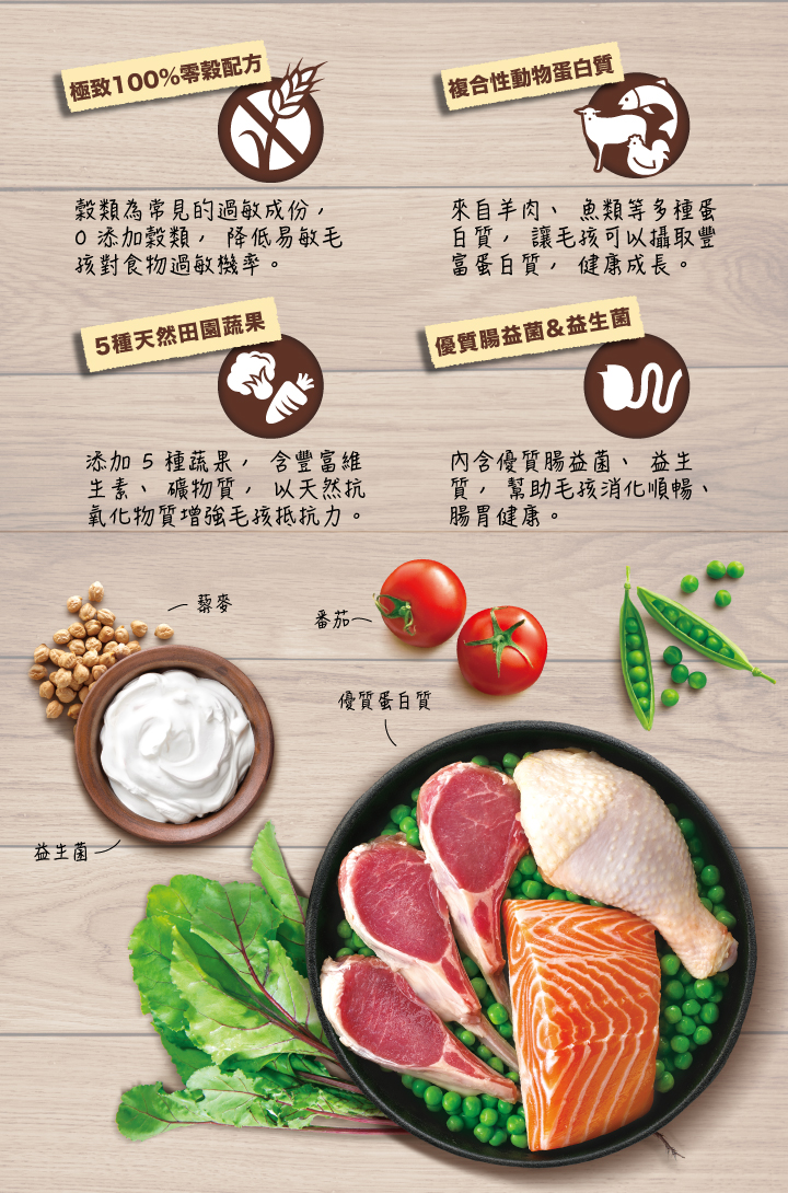 濃縮羊肉,豌豆粉,乾鷹嘴豆,乾豌豆,馬鈴薯粉,雞脂(以混合生育酚保存),濃縮雞肉,乾燥甜菜根,天然調味料,豌豆纖維,濃縮鮭魚,鮭魚油(以混合生育酚保存),乾燥蕃茄粕,食鹽,乾燥雞蛋,研磨亞麻籽,啤酒酵母萃取物,氯化膽鹼,乾燥菊苣根(菊苣纖維與果寡糖之來源),維生素(維生素E,維生素A,維生素D3,維生素B12,維生素C,維生素B2,硫胺素(維生素B1),葉酸,生物素(維生素B7),鹽酸吡哆醇(維生素B6),菸鹼酸(維生素B3),維生素K,胡蘿蔔素,泛酸鈣(維生素B5)),礦物質 (硫酸銅,碘酸鈣,硫酸亞鐵,氧化錳,氧化鋅,亞硒酸鈉,蛋白質螯合銅,蛋白質螯合鐵,蛋白質螯合鋅,蛋白質螯合錳),DL-甲硫氨酸,絲蘭萃取精華,L-抗壞血酸-2-聚磷酸鹽(維生素C活性來源),鹽酸鹽葡萄糖胺,左旋肉鹼,軟骨素,肌醇(維生素B8),嗜酸乳酸桿菌,乾酪乳酸桿菌,比菲德氏菌,腸球F菌。