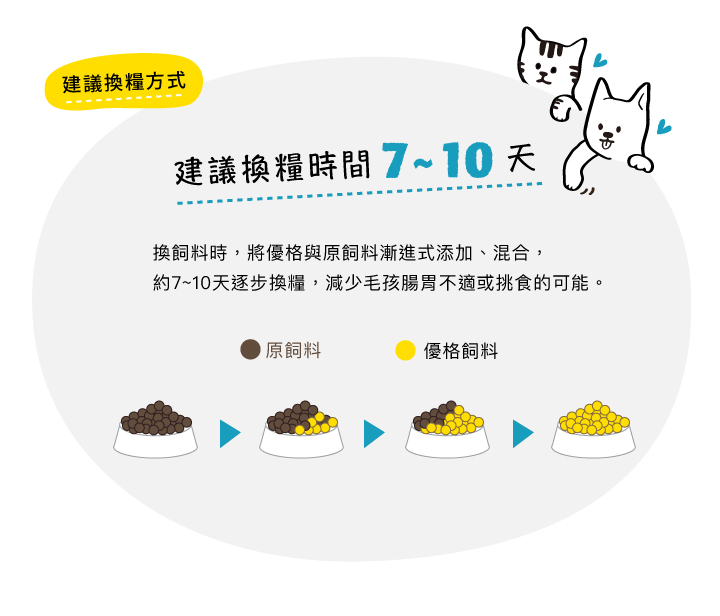 ★若狗狗為第一次食用優格寵物食譜,請先給予少量與原本的食物混合餵食,在7-10天期間內逐漸增加餵食量,直至完全餵食優格寵物食譜。