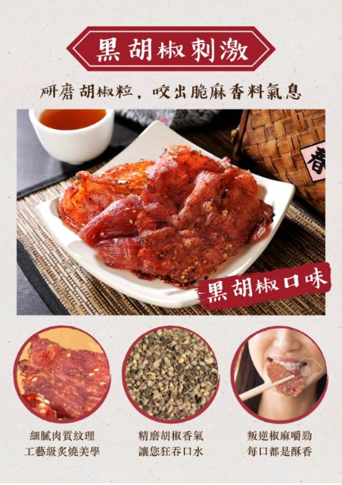 嚴選台灣溫體豬後腿肉,精心醃製,切成極致薄片,讓每一口都更輕薄順口。加入研磨黑胡椒顆粒,香氣濃郁,微辣帶勁,完美提升豬肉的鮮甜風味。低溫烘烤,保留肉質的嫩彈口感,越嚼越香,層次豐富。