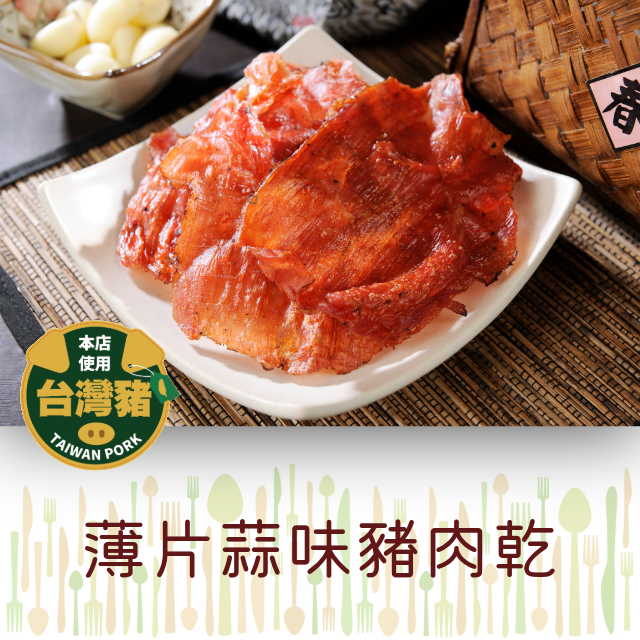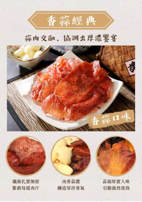 嚴選台灣溫體豬後腿肉,切成極致薄片,經獨家醃製工法,加入新鮮蒜頭與蒜萃精華,讓蒜香充分滲入肉質,帶出濃郁的風味層次。低溫烘烤技術鎖住鮮嫩口感,讓每一口都軟Q不乾硬,香氣四溢。