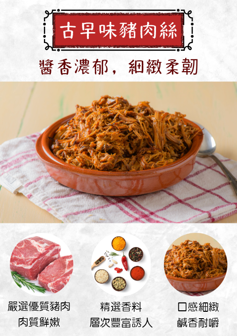 古早味豬肉絲選用優質豬後腿肉,經獨特醬料與多種香料細膩調味,慢火烘烤至醬香濃郁、口感細緻柔韌。每一絲都吸收滿滿風味,鹹甜適中,細嚼時肉香四溢,讓人回味無窮。傳承傳統手作工法,保留經典古早味,不論單吃或搭配白飯、粥品,都能帶來濃厚滿足感。