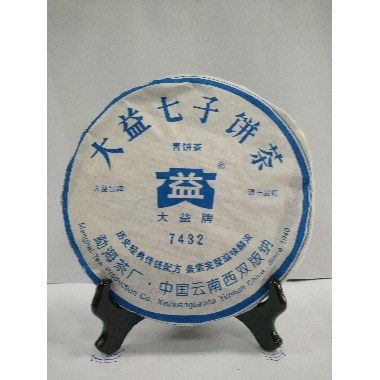 大益紅絲帶藍印7432青餅原料采自勐海茶山高海拔茶菁,經1-2年自然醇化而作,色澤烏潤顯毫,條索壯碩完整,香氣清爽含蓄,滋味回味持久。天藍色綿紙包裝意味著對早期綠印甲級圓茶的紀念,也象徵著自然醇化的風格。
