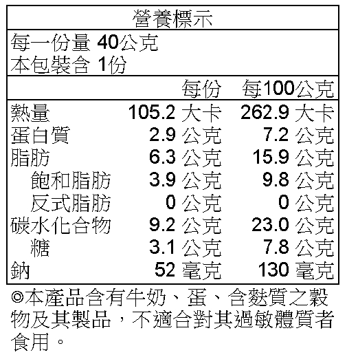 ※ 過敏原警語 : 生產之產品產含牛奶、蛋、麩質穀物、大豆類、不適合其過敏體質食用。