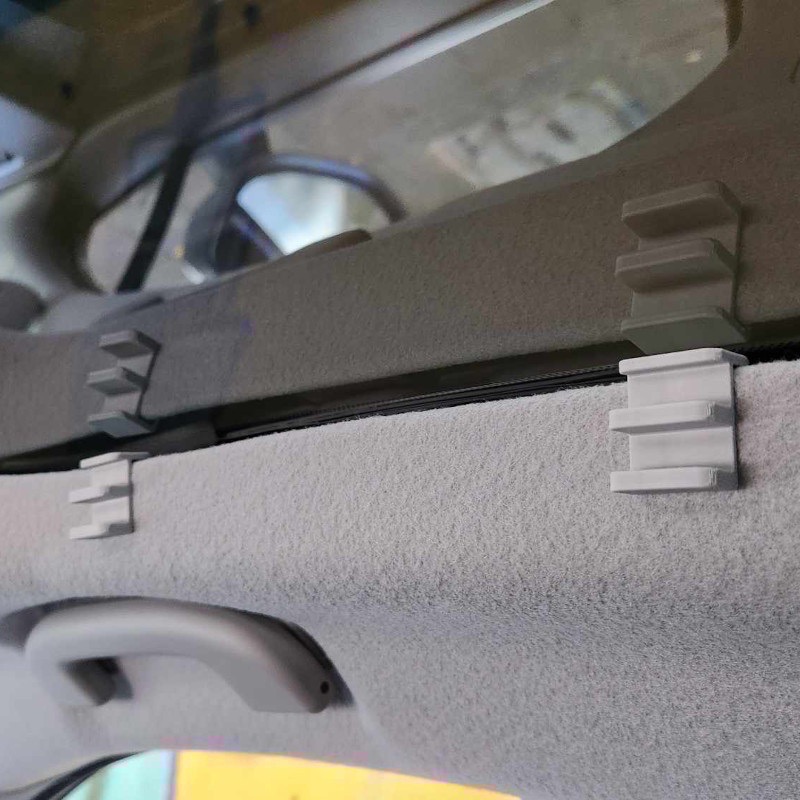自製的 Luxgen N7 天窗遮陽簾雙層掛勾,方便前方的天窗遮陽簾不用時可以收納到後方的下層掛勾,或是當後方遮陽簾不使用時可以收納到前方的下層掛勾。