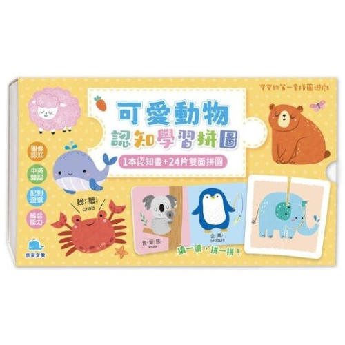 本產品包含一本認知小書及24片雙面拼圖卡。書中鮮豔可愛的插圖,吸引寶寶的專注力,並在閱讀中學習中英文單字,開啟語言之窗,豐富認知。